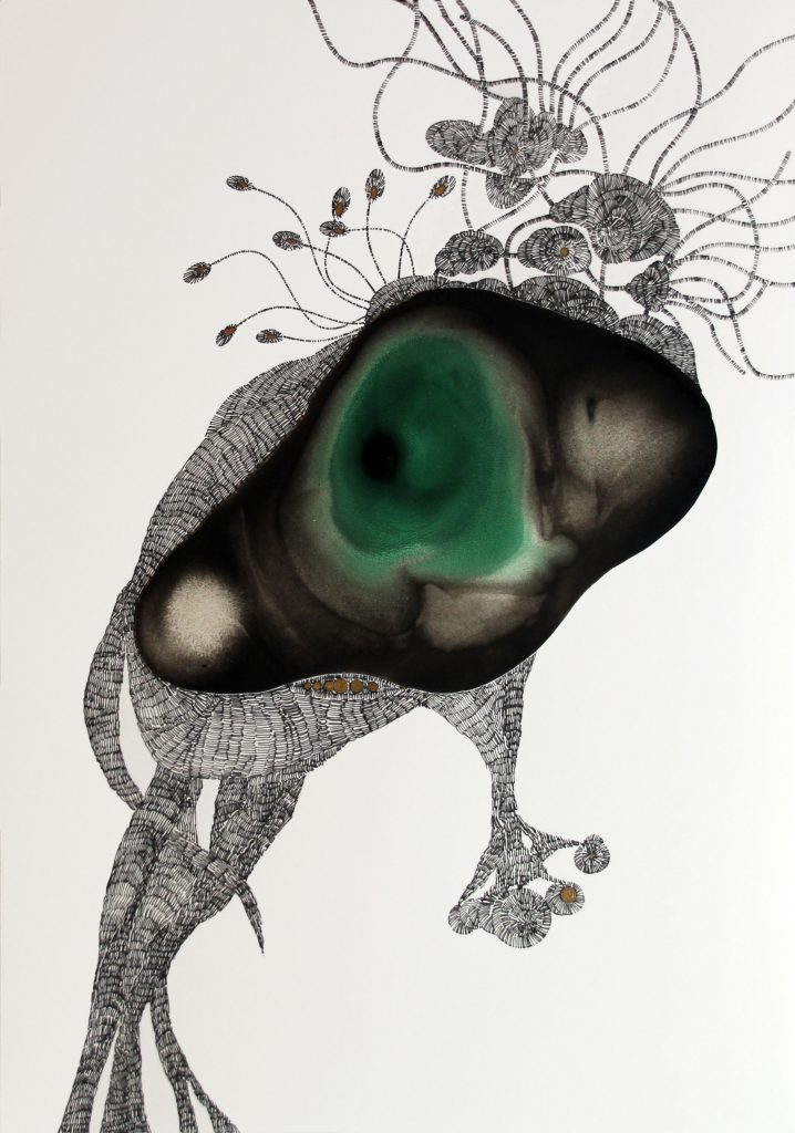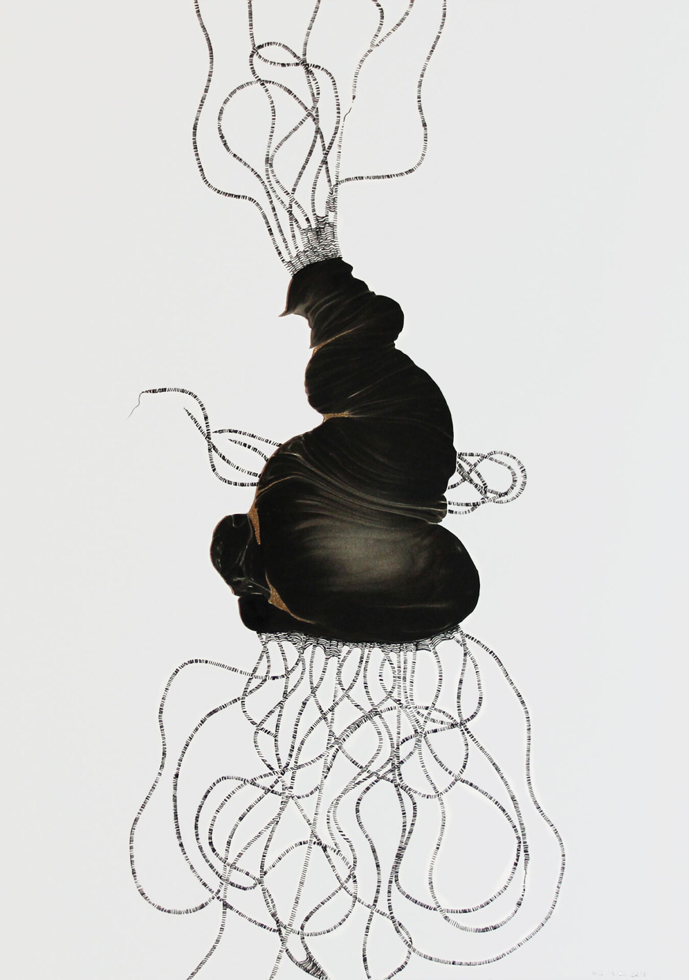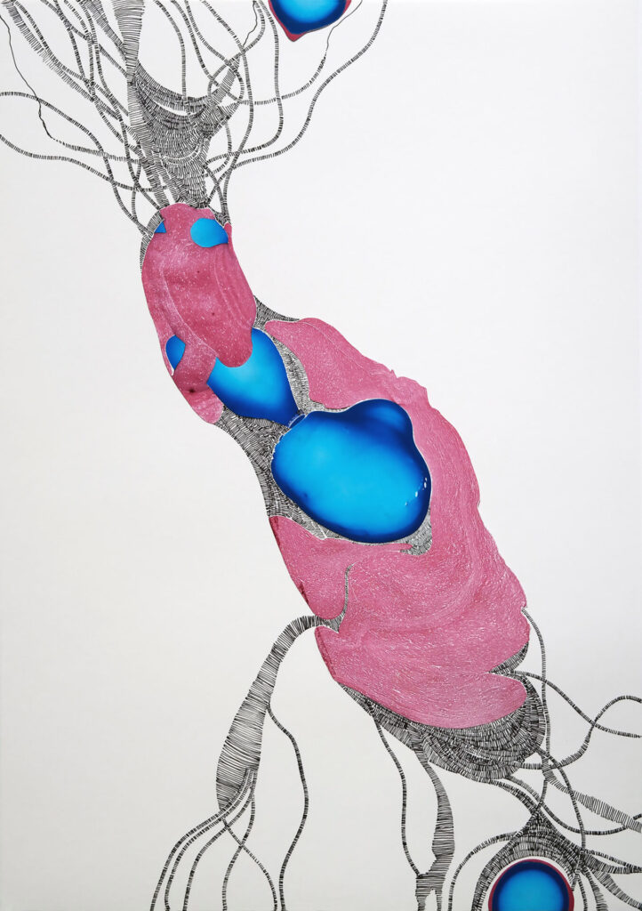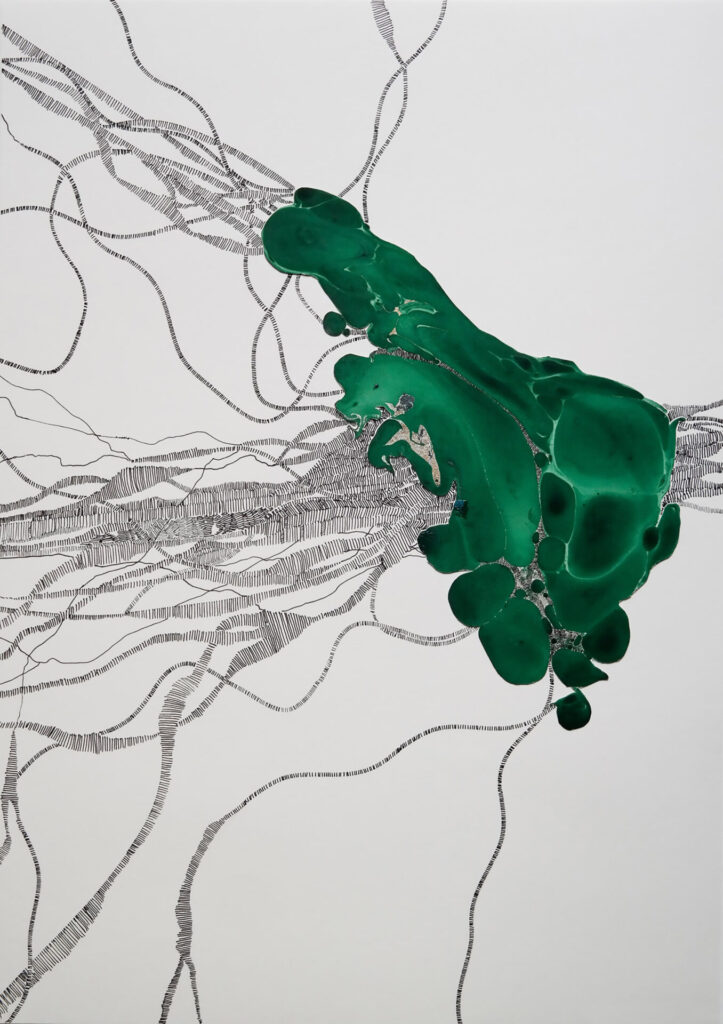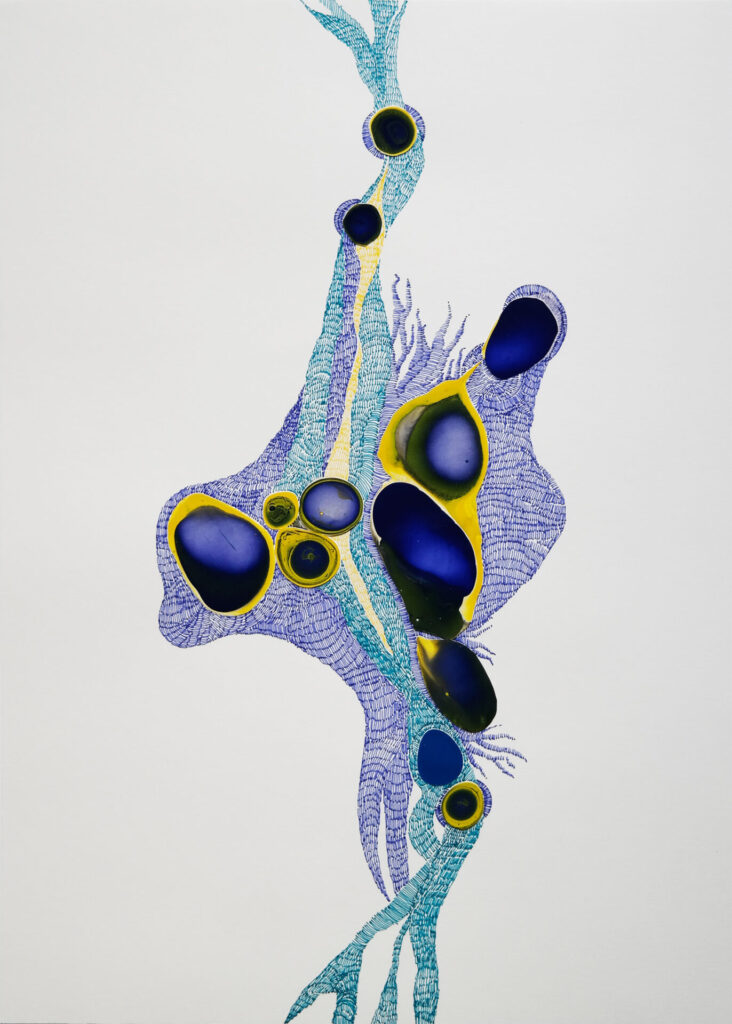 Das Spiel der Gegensätze. In meiner Serie Oxymoron verbinde ich organische Fragmente früherer Wassermonotypien mit reduzierten grafischen Linien. Organisches trifft auf Konstruiertes – ein Zusammenspiel von Natur und Struktur, Zufall und bewusster Gestaltung. Die daraus entstehenden Werke erinnern an mikroskopische Lebensformen oder an imaginäre Landschaften. Mit einfachen Vektorlinien erschaffe ich auf Papier kleine metaphysische Welten, die die Balance zwischen Chaos und Ordnung spürbar machen. Oxymoron ist Ausdruck von Transformation: Aus dem Zerfall entstehen neue Formen, neue Geschichten. Meine Arbeiten laden den Betrachter ein, innezuhalten, sich selbst als Teil eines größeren Ganzen zu erkennen und die feinen Verbindungen zwischen Mikro- und Makrokosmos zu entdecken.